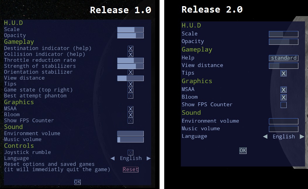 Detailed gameplay options are not adapted to casual games, for which players have a short non-engaging experience. I decided to simplify the options, and consequently to make them clearer.
